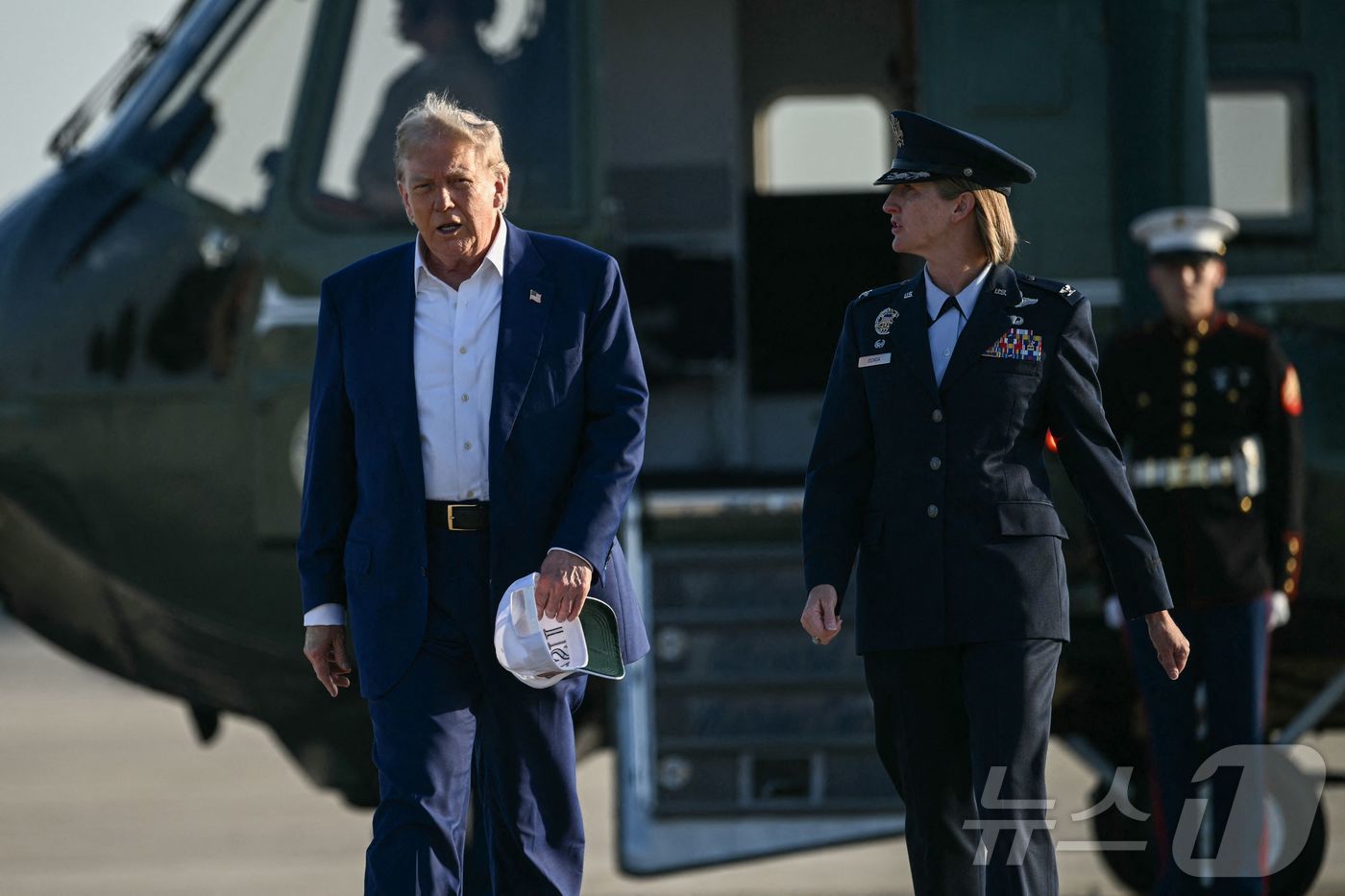 (메릴랜드 AFP=뉴스1) 류정민 특파원 = 도널드 트럼프 미국 대통령(왼쪽)이 24일(현지시간) 메릴랜드주 앤드류스 합동 기지에 착륙한 마린원(미 대통령 전용헬기)에서 내려 전용기 에어포스원으로 이동하고 있다. 트럼프 대통령은 24~25일 네덜란드 헤이그에서 열리는 북대서양조약기구(NATO, 나토) 정상회의에 참석할 예정이다. 2025.06.24 ⓒ AFP=뉴스1