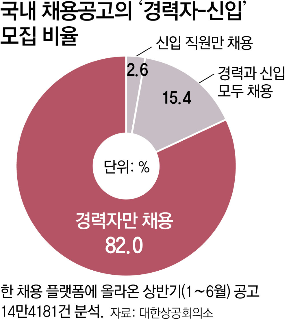 신입 구직자들은 경력자 중심의 채용 시장에서 구직에 어려움을 겪고 있었다. 대한상의는 대졸 청년 구직자 1000여 명을 대상으로 ‘청년 취업 인식조사’(복수응답)를 진행했는데 청년들이 꼽은 첫 번째 취업 진입장벽이 ‘경력 중심의 채용’(53.9%)이었다. 이 조사에 따르면 청년 구직자의 53.2%는 대학 재학 중 별도의 직무 경험을 쌓지 않았다.