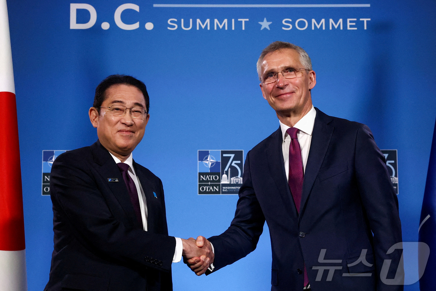 11일(현지시간) 미국 워싱턴에서 열린 나토 창설 75주년 기념 정상회의에서 옌스 스톨텐베르크 나토 사무총장과 기시다 후미오 일본 총리가 악수를 나누고 있다.2024.07.11/ ⓒ 로이터=뉴스1 ⓒ News1 이강 기자 |