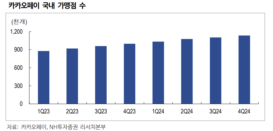 카카오페이의 국내 가맹점 수가 2023년 1분기부터 2024년 4분기까지 분기별로 꾸준히 증가한 추세가 25일 NH투자증권의 목표주가 상향과 더불어 배경 자료로 제공되고 있다. |