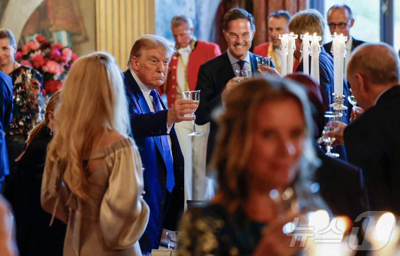 도널드 트럼프 미국 대통령이 24일(현지시간) 네덜란드 헤이그 하우스텐보스궁에서 열린 북대서양조약기국 회원국 정상 만찬에서 잔을 들어 올리고 있다. ⓒ AFP=뉴스1 |