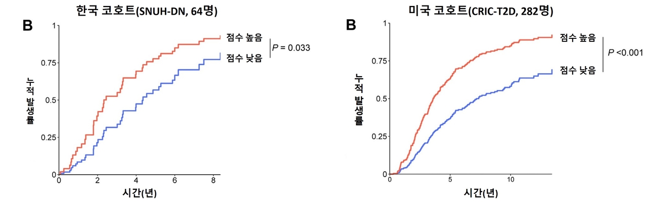 보체 점수에 따른 당뇨병콩팥병의 진행 확률. 다른 임상 변수를 보정했을 때, 보체 점수가 높은 환자는 당뇨병콩팥병이 빠르게 진행될 위험이 2배 이상 높았고, 이 결과는 한국 및 미국 코호트에서 동일했다. |