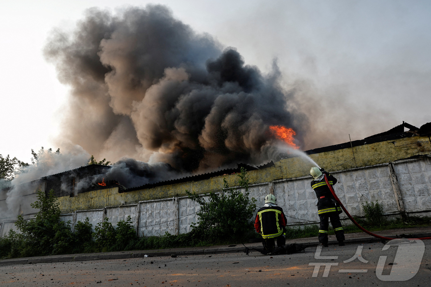 10일(현지시간) 우크라이나 수도 키이우에서 러시아의 드론 공격으로 화재가 발생한 건물에 소방관들이 소방호스로 물을 뿌리고 있다. 2025.06.10 ⓒ 로이터=뉴스1 ⓒ News1 최종일 선임기자 |