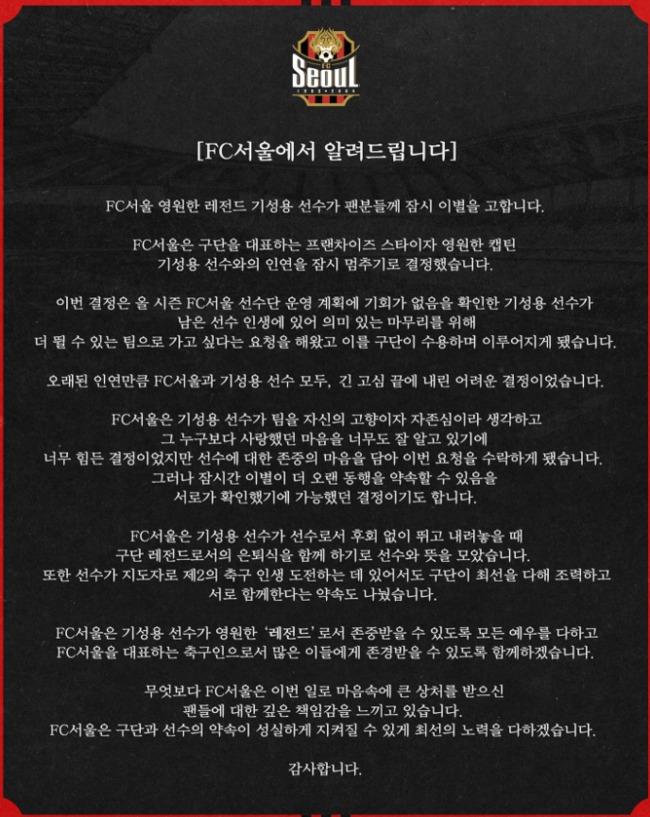 서울은 25일 공식 SNS를 통해 "서울 영원한 레전드 기성용 선수가 팬분들께 잠시 이별을 고한다. 서울은 구단을 대표하는 프랜차이즈 스타이자 영원한 캡틴 기성용 선수와의 인연을 잠시 멈추기로 결정했다. 이번 결정은 올 시즌 서울 선수단 운영 계획에 기회가 없음을 확인한 기성용 선수가 남은 선수 인생에 있어 의미 있는 마무리를 위해 더 뛸 수 있는 팀으로 가고 싶다는 요청을 해왔고 이를 구단이 수용하며 이루어지게 됐다"라며 기성용과의 이별을 공식적으로 알렸다.