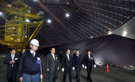지난 2010년 정몽구 현대기아차 명예회장이 이명박 대통령과 함께 당진 현대제철 일관제철소 준공식에서 밀폐 돔형 원료처리시설를 둘러보고 있다. [중앙포토] |
