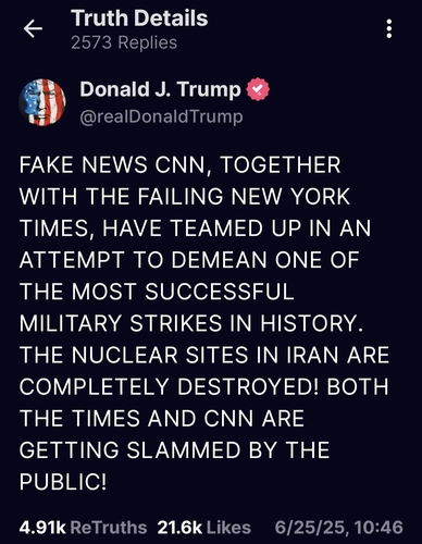 그는 "이란의 핵 시설들은 완전히 파괴됐다"라면서 "뉴욕타임스와 CNN은 모두 대중으로부터 비난받고 있다"라고 주장했습니다.