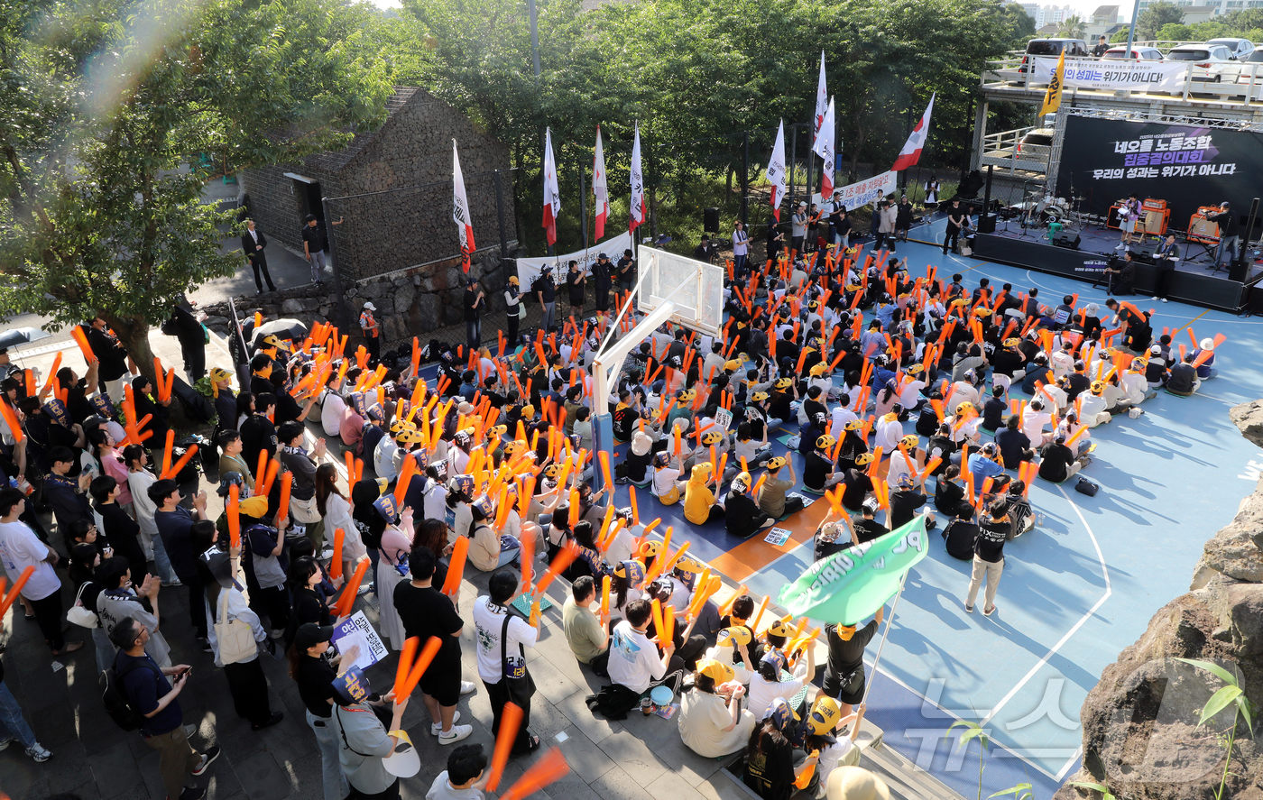 민주노총 화학섬유식품노조 넥슨지회 네오플분회 소속 네오플 본사 직원들이 25일 오후 제주시 노형동 네오플 본사 농구장에서 전면 파업에 따른 집중 결의대회를 하고 있다. ⓒ News1 오미란 기자 |