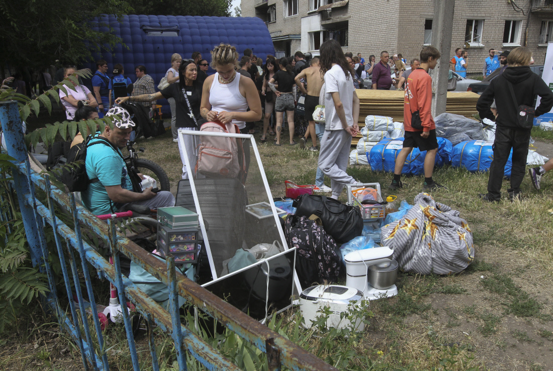살림살이 챙겨 피신 24일(현지시간) 러시아의 공격을 받은 우크라이나 중부 드니프로에서 시민들이 파손된 건물 바깥에 가재도구를 둔 채 서 있다. EPA연합뉴스 |