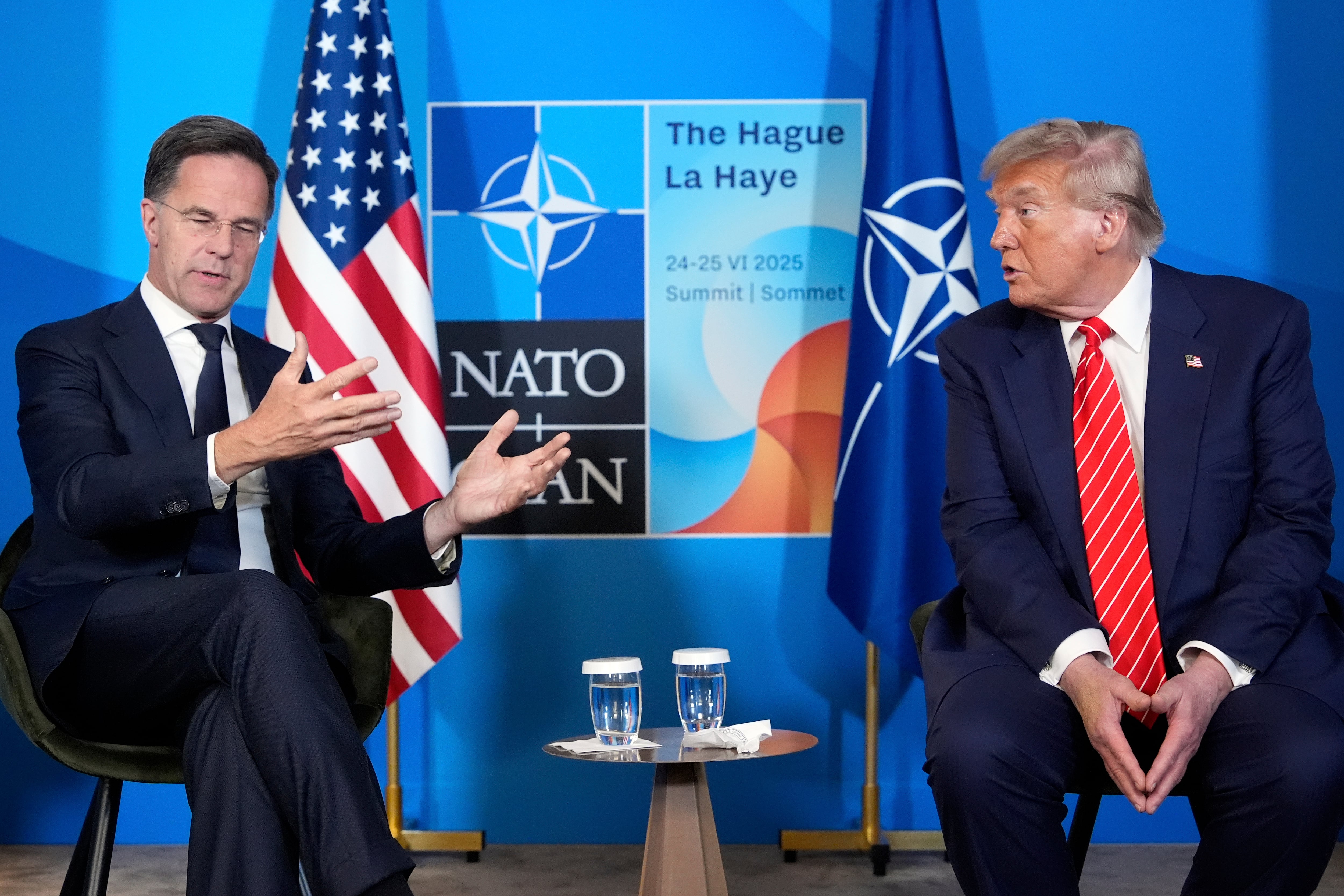 도널드 트럼프 미국 대통령이 25일(현지 시각) 네덜란드 헤이그에서 열린 나토(NATO) 정상회의에서 마르크 뤼터 나토 사무총장과 만나 인사를 나누고 있다.도널드 트럼프 미국 대통령이 25일 네덜란드 헤이그에서 열린 나토(NATO) 정상회의에서 마르크 뤼터 나토 사무총장과 공개 회담을 하고 있다. /AP 연합뉴스 |