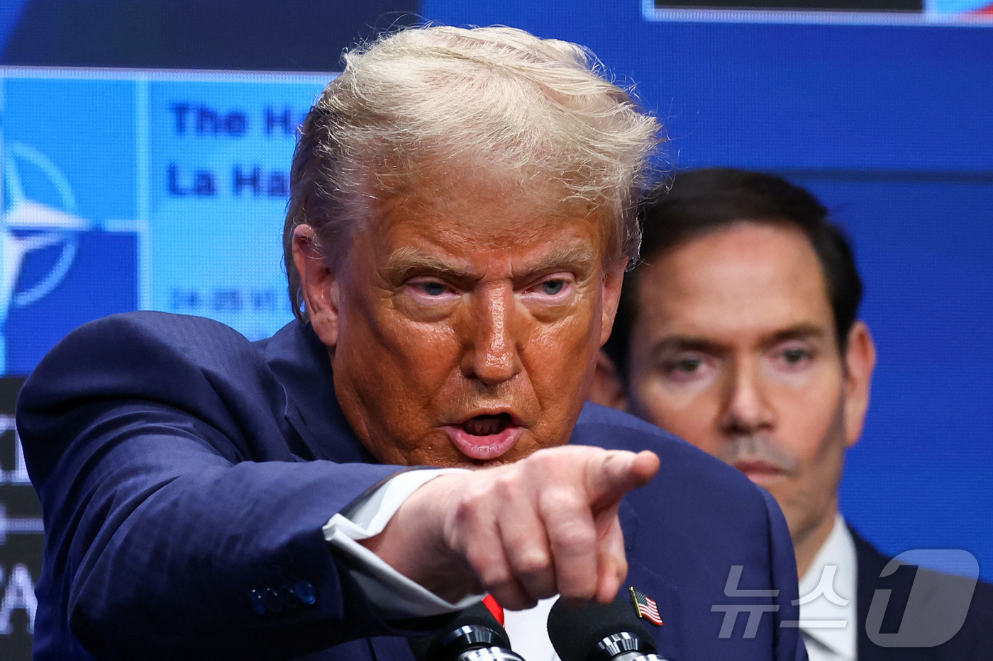 (헤이그 로이터=뉴스1) 류정민 특파원 = 도널드 트럼프 미국 대통령이 25일(현지시간) 네덜란드 헤이그에서 열린 북대서양조약기구(NATO, 나토) 정상회담을 계기로 연 기자회견에서 질문자를 지정하고 있다. 2025.06.25 ⓒ 로이터=뉴스1