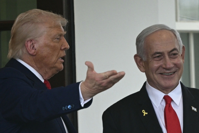 도널드 트럼프 미국 대통령이 7일(현지시간) 워싱턴 백악관에서 방미 중인 베냐민 네타냐후 이스라엘 총리를 환영하고 있다. 2025.04.08 /AFPBBNews=뉴스1 |
