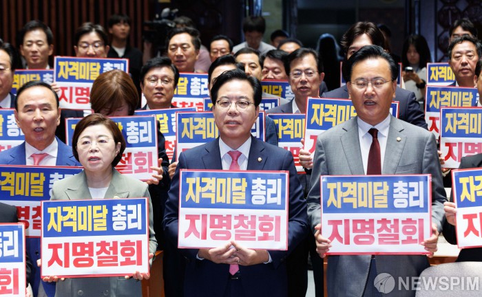 [서울=뉴스핌] 윤창빈 기자 = 송언석 국민의힘 원내대표를 비롯한 당 소속 의원들이 26일 오전 서울 여의도 국회에서 김민석 국무총리 후보자 지명 철회를 촉구하는 피켓팅을 하고 있다. 2025.06.26 pangbin@newspim.com