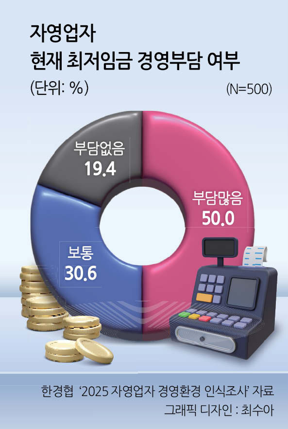 자영업자 절반(50.0%)은 현재의 최저임금(2025년 최저시급 1만30원)이 이미 경영에 많은 부담으로 작용하고 있다고 응답했다.