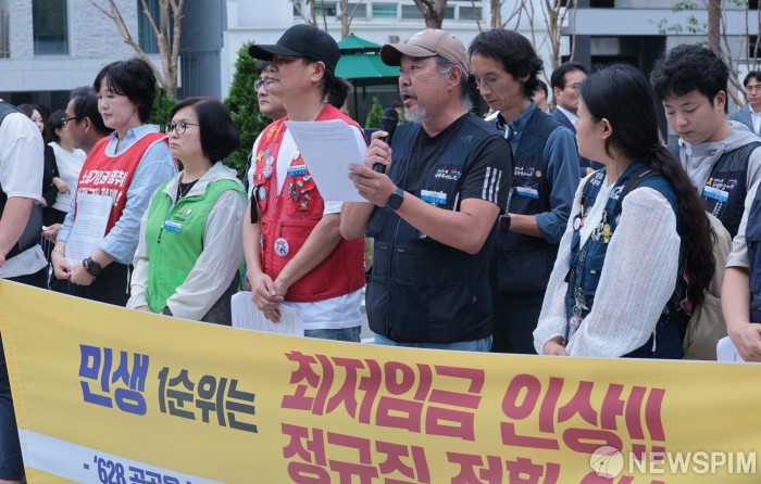 [서울=뉴스핌] 이길동 기자 = 민주노총 공공운수노조 관계자들이 26일 서울 종로구 정부서울청사 창성동 별관 국정기획위원회 앞에서 628 공공운수노조 비정규직 노동자들이 투쟁하는 이유 기자회견을 하고 있다. 2025.06.26 gdlee@newspim.com