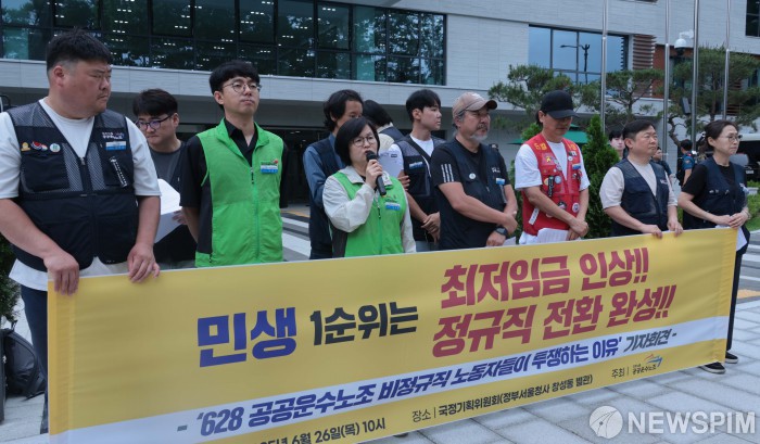 [서울=뉴스핌] 이길동 기자 = 민주노총 공공운수노조 관계자들이 26일 서울 종로구 정부서울청사 창성동 별관 국정기획위원회 앞에서 628 공공운수노조 비정규직 노동자들이 투쟁하는 이유 기자회견을 하고 있다. 2025.06.26 gdlee@newspim.com