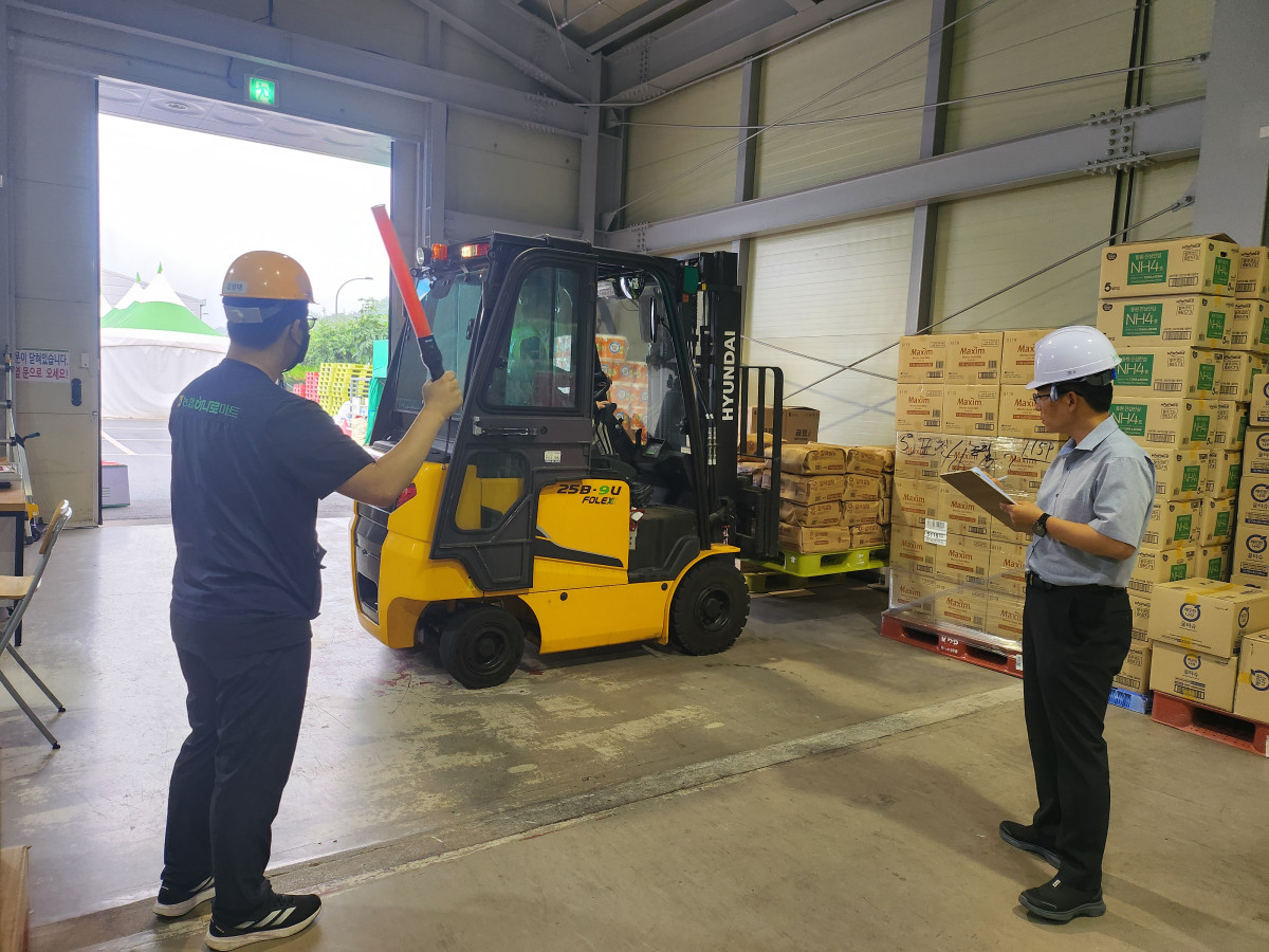 25일 별내농협 하나로마트에서 농협 경기검사국 관계자들이 안전모를 착용한 채 포크리프트 주변에서 중대재해 예방을 위한 시설 안전 점검을 실시하고 있다. |