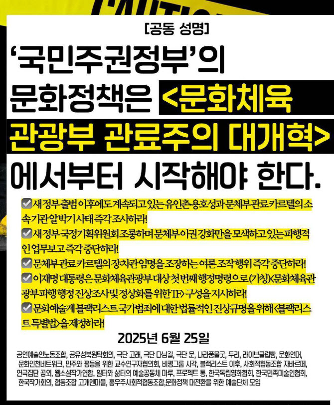 이들 단체는 “블랙리스트 국가범죄, 문체부 소속 기관의 인사 참사(문체부 관료 출신의 회전문·낙하산 인사 일상화), 소속 기관과 문화 현장 전반의 하청계열화(행정 주도의 비상식적이고 위계적인 지원사업구조), 민관 협력 거버넌스의 파괴와 지역문화 배제 등이 문체부 관료주의의 축적된 결과물”이라면서 “지금 문체부에는 윤석열들이 너무 많다. 문체부 관료주의에 대한 대개혁 없이는 그 어떤 문화정책과 의제도 더 이상 의미가 없다”고 강조했다.