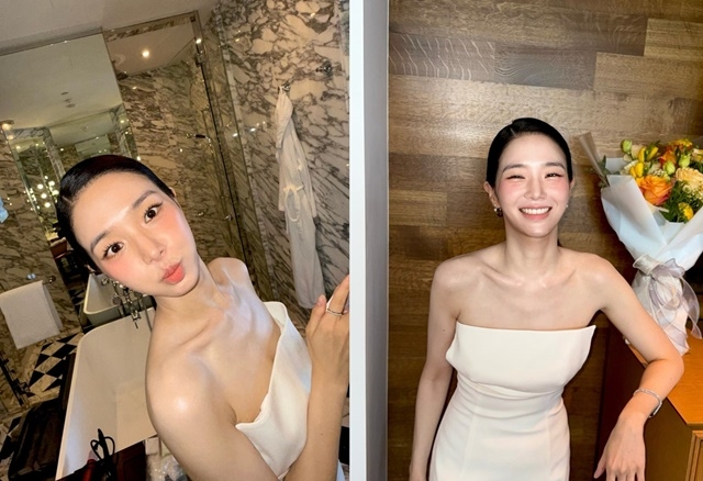 공개된 사진 속 박규영은 순백의 오프숄더 드레스를 입고 우아한 자태를 뽐냈다. 단정하게 올린 헤어스타일과 투명한 메이크업이 그녀의 청순한 매력을 한층 더 부각시켰다.