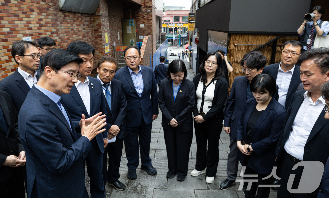 (서울=뉴스1) 이승배 기자 = 이해식 국정기획위원회 정치행정분과장이 위원들과 함께 26일 오후 서울 용산구 이태원 참사 현장인 '10.29 기억과 안전의 길'을 살펴보고 있다. 2025.6.26/뉴스1