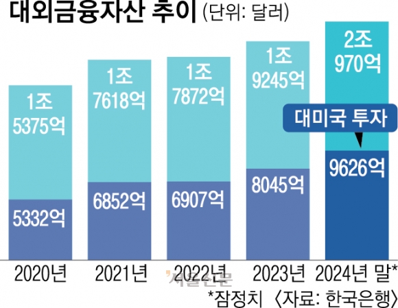 한국은행이 26일 발표한 ‘2024년 지역별·통화별 국제투자대조표(잠정)’에 따르면 지난해 말 우리나라 지역별 대외금융자산 잔액(준비자산 제외)은 2조 970억달러로, 전년 말 대비 1724억달러 증가한 것으로 집계됐다. 이는 1년 사이 국민들이 보유한 해외 금융자산이 약 9% 늘어났다는 것을 의미한다.