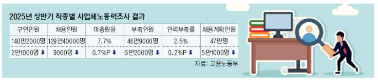 고용노동부가 26일 발표한 ‘2025년 상반기 직종별 사업체노동력조사 결과’에 따르면 4월 1일 기준 국내 기업들의 부족인원은 46만9000명으로 전년 동기보다 10.0%(5만2000명) 줄었다. 이에 따라 올해 2∼3분기 채용계획인원도 47만명으로 9.7%(5만1000명) 감소했다.