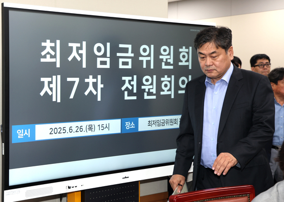 이인재 최저임금위원장이 26일 정부세종청사에서 열린 최저임금위원회 제7차 전원회의에 입장하고 있는 모습. 〈사진=연합뉴스〉 |