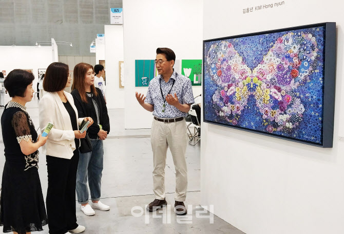 [이데일리 김태형 기자] ‘나비작가’ 김홍년 작가가 26일 개막한 ‘2025 화랑미술제 in 수원’에서 자신의 작품 화접을 관람객들에게 설명하고 있다.