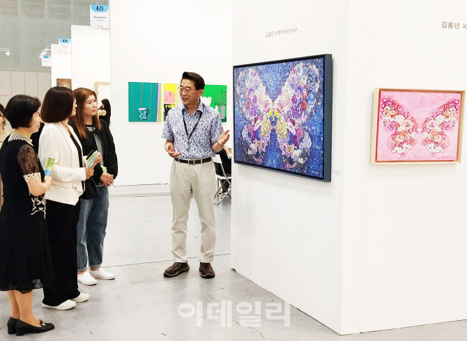 [이데일리 김태형 기자] ‘나비작가’ 김홍년 작가가 26일 개막한 ‘2025 화랑미술제 in 수원’에서 자신의 작품 화접을 관람객들에게 설명하고 있다.