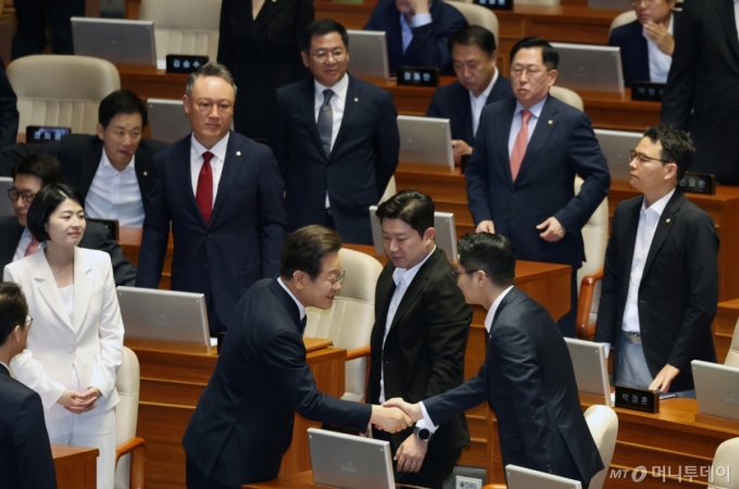 [서울=뉴시스] 국회사진기자단 = 이재명 대통령이 26일 서울 여의도 국회에서 열린 본회의에서 추가경정예산안 시정연설을 마친 후 국민의힘 의원들과 인사하고 있다. 2025.06.25. photo@newsis.com /사진= |