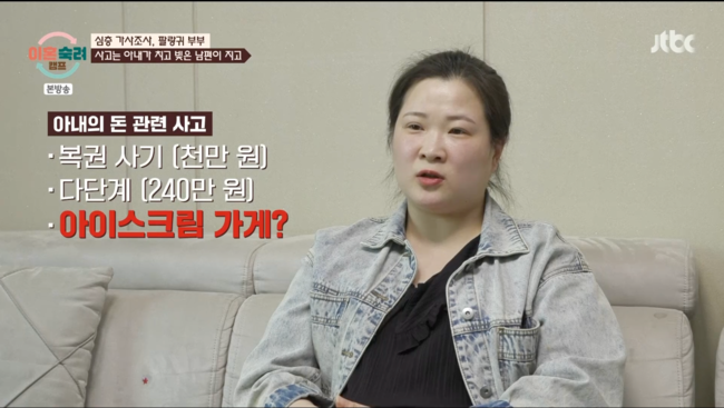 다단계도 있었다는 아내는 “친구가 알려줘서 다단계를 했다. 240만원 정도 (사기르 당했다)”라고 밝혔다. 이어 아이스크림 가게를 한다고 사기를 당하기도 했다고. 아내는 주식 리딩방으로 천만 원 정도 날리기도 했다고 밝혀 모두를 놀라게 만들었다.
