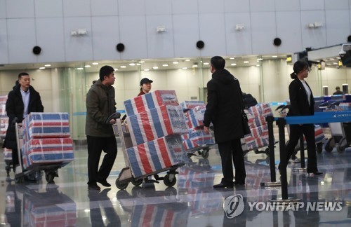 2019년 베이징 공항에서 귀국길에 오르는 북한 노동자 추정 일행 |