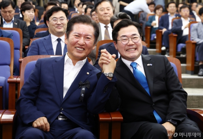 민주당은 내달 10일 당 대표 후보자 등록을 실시한다. 현재까지 정청래·박찬대 의원이 출사표를 낸 상황이다. 등록 후보자가 3명을 넘길 경우 15일 예비경선을 치르고 최종 후보자를 확정한다. 이후 19일 충청지역을 시작으로 영남(20일), 호남(26일), 경기·인천(27일) 등 권역별 순회경선을 치른 뒤 전당대회가 열리는 8월2일 서울·강원·제주 지역 투표 결과를 합산해 당 대표를 확정할 계획이다.