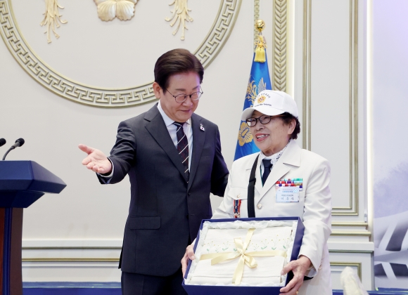 이재명 대통령이 27일 청와대 영빈관에서 열린 ‘호국보훈의 달, 대통령의 초대’ 행사에서 특별초청 대상자인 6·25전쟁 참전유공자 이춘자 참전용사에게 광목이불 선물을 전달하고 있다. 대통령실 제공 |