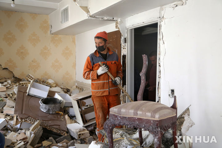 [테헤란=신화/뉴시스] 25일(현지 시간) 이란 테헤란에서 한 남성이 이스라엘의 공습으로 파손된 건물 내부를 치우고 있다. 2025.06.27. |