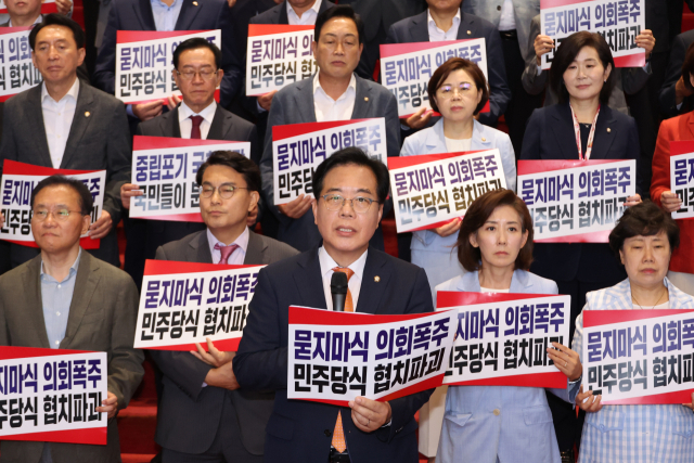 ▲국민의힘 송언석 원내대표가 27일 서울 여의도 국회에서 여당의 법제사법위원장 등 상임위원장 선출을 규탄하는 발언을 하고 있다. ⓒ연합뉴스 |