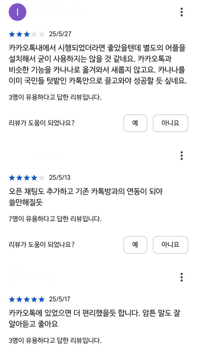 구글 플레이스토어의 카나나 앱 사용자 리뷰 캡쳐 |