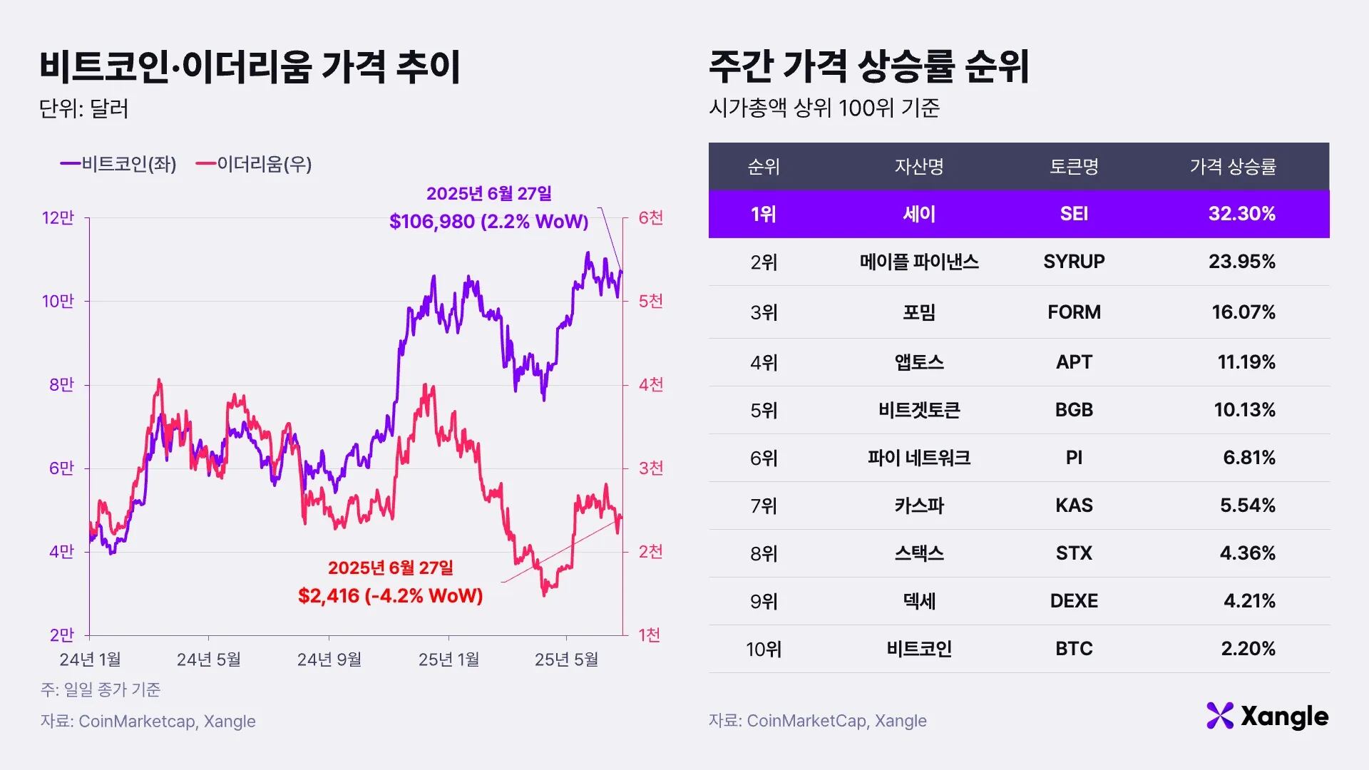 27일 비트코인은 주간 기준 2.2% 상승한 10만6980달러로 마감했다. 이더리움은 4.2% 하락한 2416달러를 기록했다. 알트코인 시장에서는 세이(SEI, +32.30%), 메이플 파이낸스(SYRUP, +23.95%), 포밈(FORM, +16.07%) 등이 강세를 보였다.