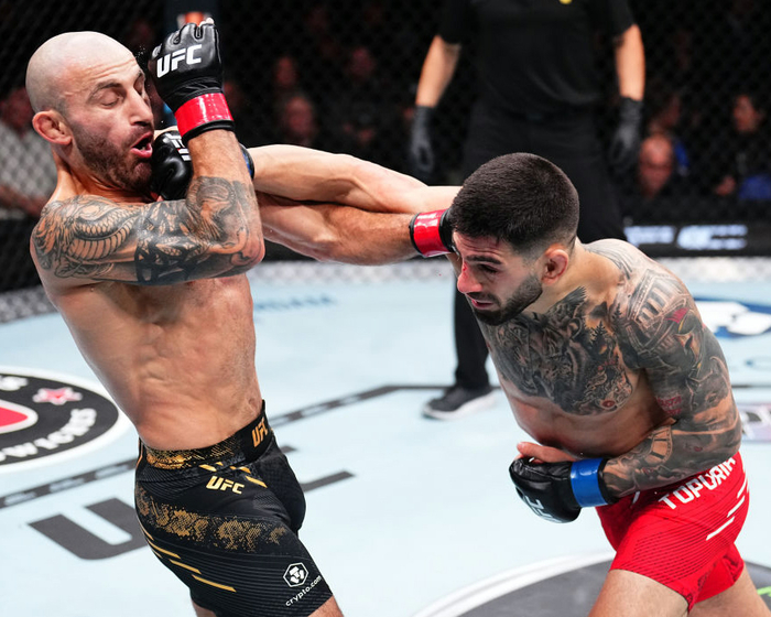 일리아 토푸리아가 알렉산더 볼카노프스키에게 펀치 공격을 하고 있다. 사진 | UFC |