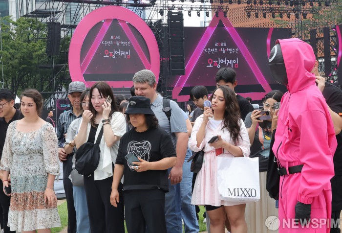 [서울=뉴스핌] 양윤모 기자 = 28일 오후 서울광장이 넷플릭스 시리즈 ‘오징어 게임 시즌 3' 기념무대로 변신한 가운데,국내외 팬들이 야간 행사를 기다리며 부대행사에 참여하고 있다. 2025.06.28 yym58@newspim.com