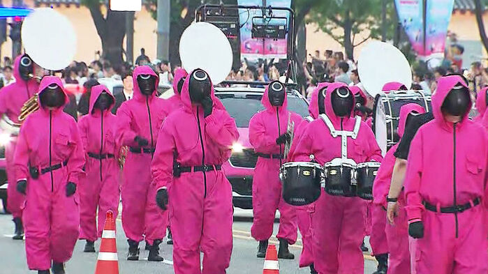 이곳 퍼레이드에는 오징어 게임 속 다양한 캐릭터들이 함께하고 있는데 게임 속 참가자들과 대척점에 있었던 핑크색 옷을 입은 가드들도 함께하고 있습니다.