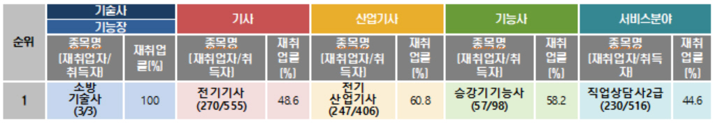 재취업 성공률이 가장 높은 종목(취득자 50인 이상 중)은 각 등급별로 전기기사가 48.6%, 전기산업기사 60.8%, 승강기기능사 58.2%, 직업상담사 2급 44.6%였고, 재취업 소요기간이 가장 짧은 종목(재취업자 수 30인 이상 중)을 등급별로 보면, 에너지관리기사 42.2일, 공조냉동기계산업기사 43.7일, 자동차정비기능사 52.7일, 사회조사분석사 2급 82.6일로 나타났다.
