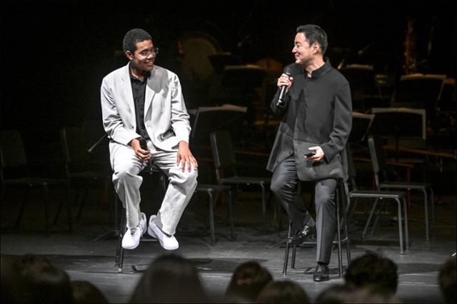 20여 년간 공연 기획과 음악에 대한 글쓰기를 해 온 이지영 대원문화재단 전문위원이 클래식 음악 무대 옆에서의 경험과 무대 밑에서 느꼈던 감정을 독자 여러분에게 친구처럼 편안하게 전합니다.작곡가 이하느리(왼쪽)와 지휘자 최수열이 26일 세종문화회관 M씨어터에서 열린 '장단의 재발견' 공연 중 연주할 신곡에 대한 대화를 나누고 있다. 세종문화회관 제공 |