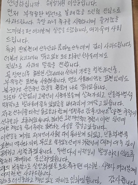 축구팬들이 이에 대해 숱하게 비판하자 이 해설위원은 고개를 숙였다. 이 해설위원은 28일 자신의 사회관계망서비스(SNS)를 통해 자필 사과문을 올렸다.