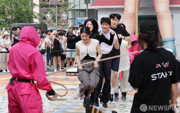 [서울=뉴스핌] 김학선 기자 = 29일 서울 광화문 광장에서 열린 '2025 K-콘텐츠 서울여행주간 : 오징어 게임 팝업 광화문' 행사를 찾은 시민들이 줄넘기 게임을 하며 즐거운 시간을 보내고 있다. '오징어 게임 팝업 광화문'은 내달 6일까지 열리며 현장에는 오징어 게임 속 상징적인 요소들을 체험할 수 있는 다양한 포토존과 전시, 미니 게임 등이 마련돼 있다. 2025.06.29 yooksa@newspim.com