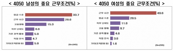 조사 결과에 따르면 4050 중장년 구직자가 재취업 시 가장 중요하게 여기는 근무조건으로 남성은 임금 수준(33.7%)을 가장 많이 꼽았고 △근무 시간(28.0%) △고용 형태(15.3%) △직무 난이도나 업무 강도(6.6%) 등이 뒤를 이었다. 여성은 △근무 시간(49.6%) △임금 수준(20.5%) △직무 난이도나 업무 강도(11.0%) △고용 형태(9.7%) 순으로 많이 응답했다.