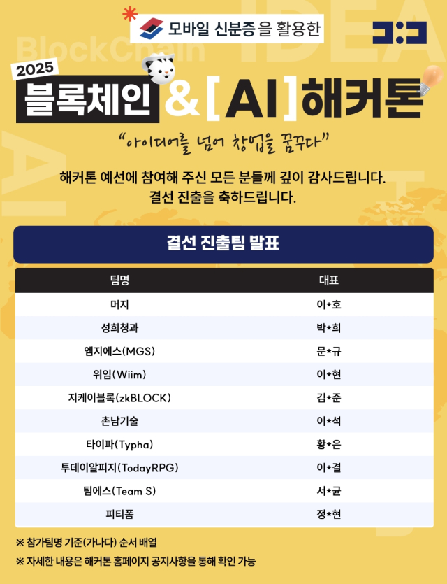 이기혁 한국디지털인증협회장은 "해커톤에 참가한 모든 팀들의 열정과 창의적인 아이디어에 깊이 감사드린다"며 "이번 대회가 블록체인과 AI 기반의 혁신을 촉진하고, K-DID 기술의 글로벌 확산을 이끄는 중요한 계기가 되길 기대한다"고 말했다.