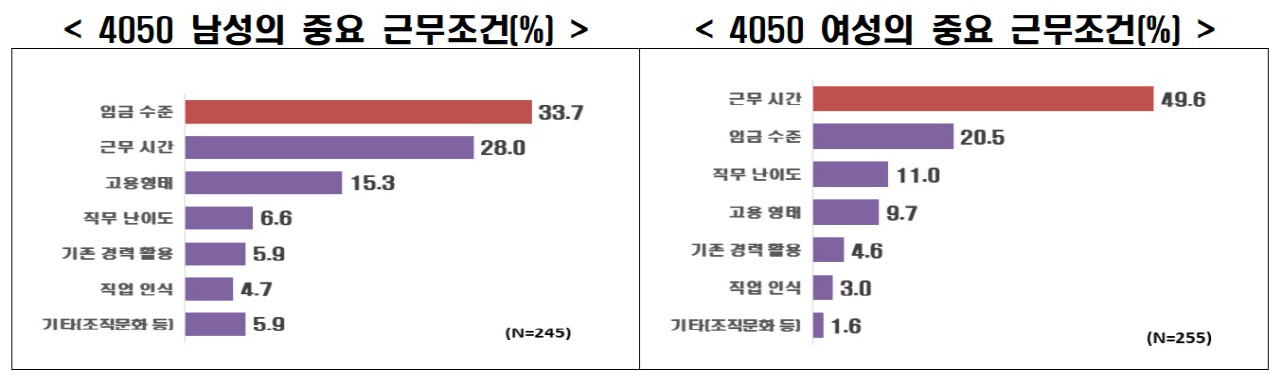 재취업 시 중요하게 여기는 근무조건에서 남녀 차이가 뚜렷하게 나타났다. 남성은 임금 수준(33.7%)을 가장 중시했고 근무 시간(28.0%), 고용 형태(15.3%) 순이었다. 반면 여성은 근무 시간(49.6%)을 최우선으로 꼽았다. 임금 수준(20.5%), 직무 난이도(11.0%), 고용 형태(9.7%) 등이 뒤를 이었다.