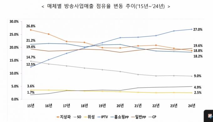 지난해 전체 방송사업 매출은 2023년 대비 0.9% 감소한 18조8042억원으로 집계됐다. 방송사업매출은 지난 10년간 증가세를 보이다가 2년 연속 감소했다.