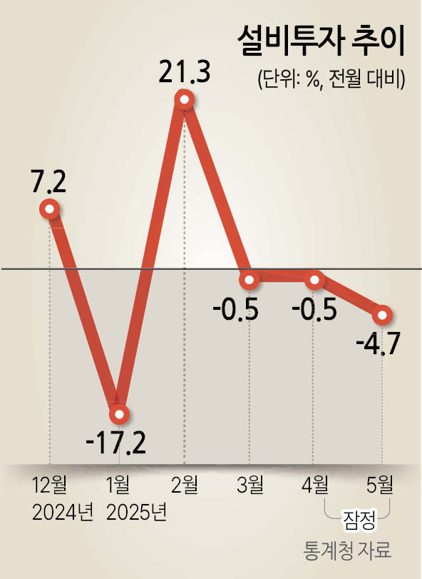 5월 전산업 생산이 두 달 연속 감소하고 설비투자는 석 달째 마이너스를 기록했다. 소매 판매는 보합에 머물렀다. 미국 관세 여파 등 대내외 불확실성이 커지면서 ‘트리플 마이너스’를 기록했던 4월의 ‘침체의 늪’에서 벗어나지 못한 모습이다.