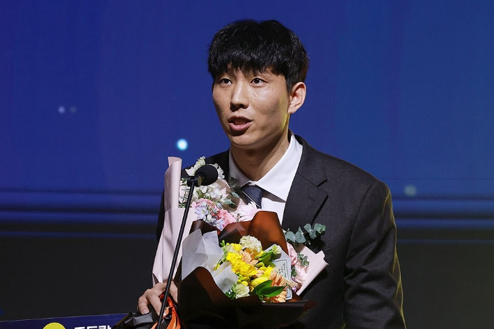 '도드람 2024-2025 V리그' 시상식에서 남자부 베스트 7에 선정된 세터 KB손해보험 황택의가 소감을 밝히는 모습. 연합뉴스 |